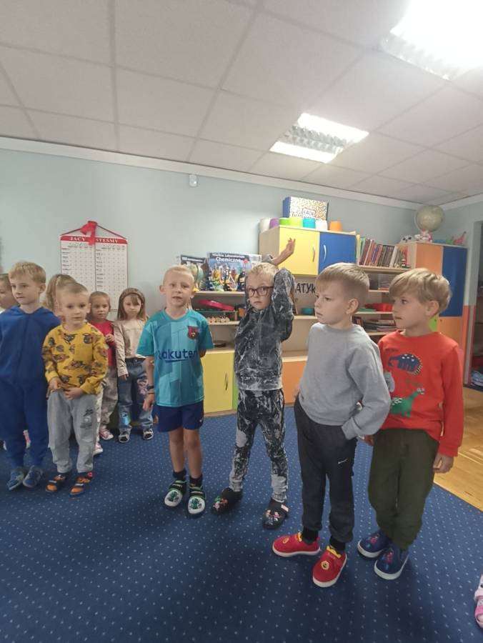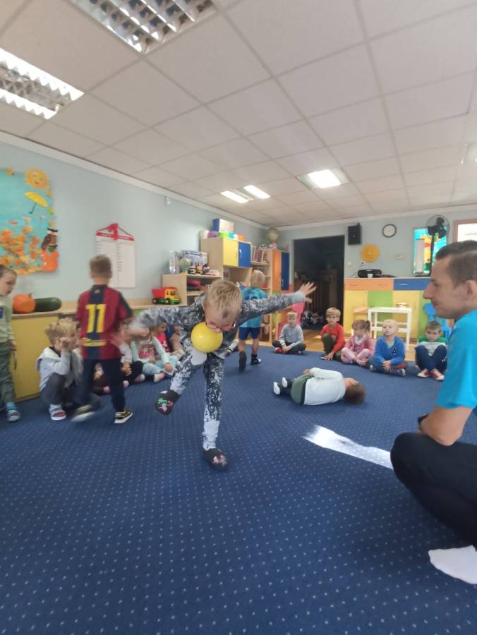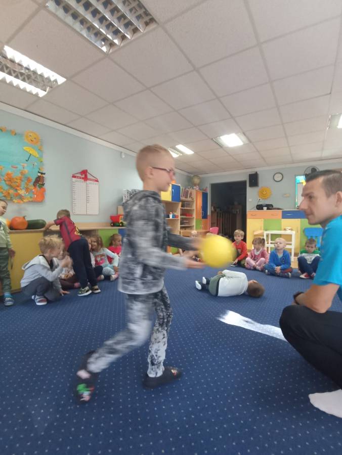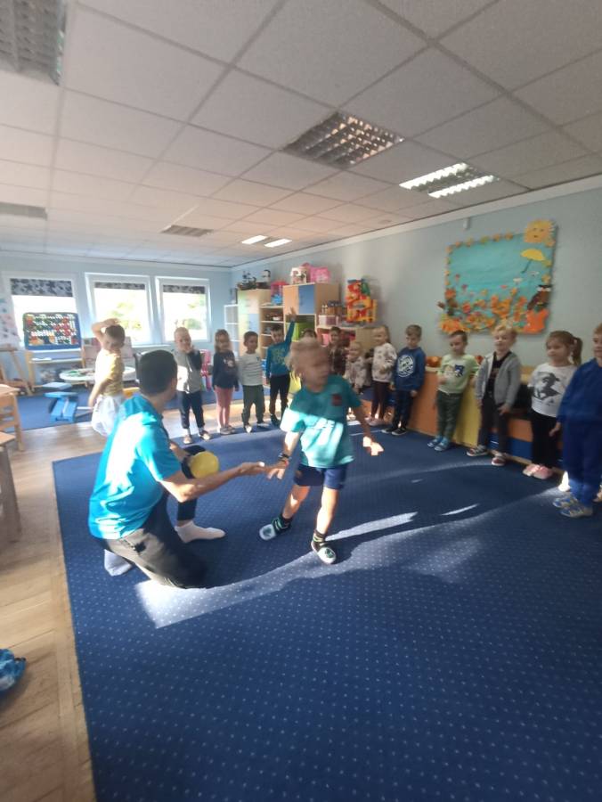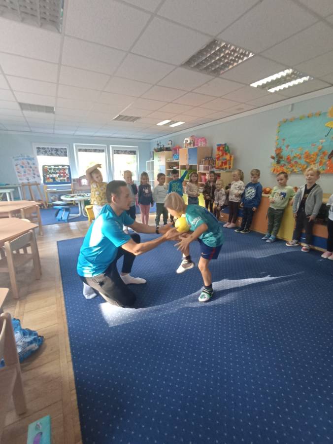 Chłopcy ze Stokrotek uczestniczą w spotkaniu z piłkarzem - tatą z Niezapominajek