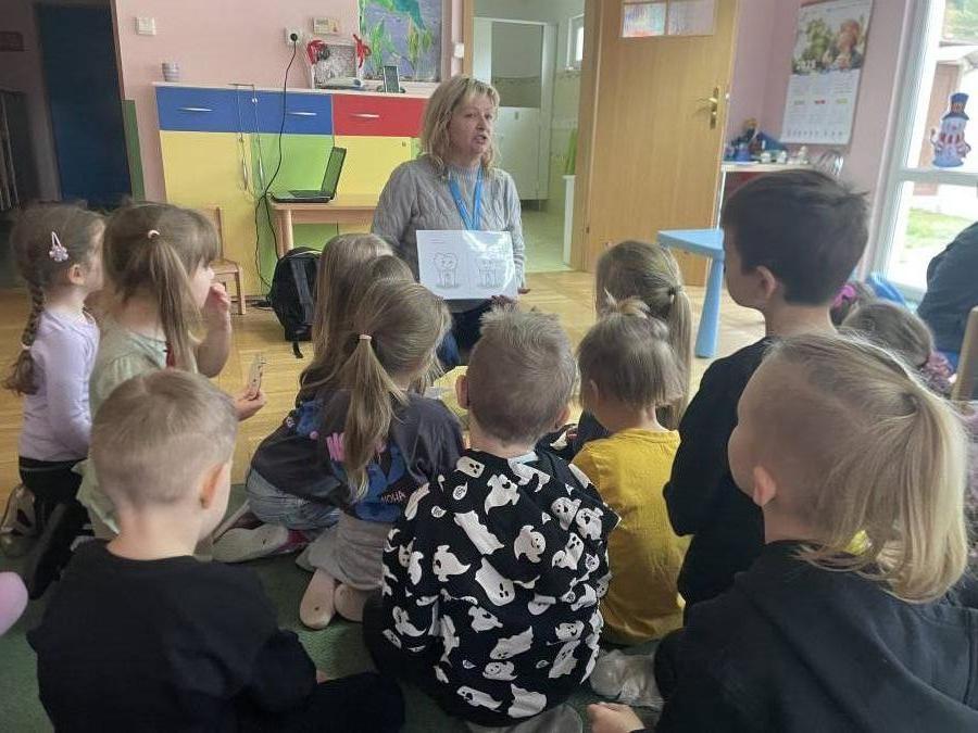 Pani z sanepidu rozmawia ze Stokrotkami i Szafirkami na temat zdrowia